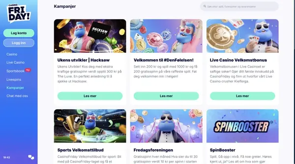 Friday kjører løpende kampanjer som er laget for jevn spilling heller enn engangskrav. SpinBooster er lojalitetssystemet vårt der hvert spinn fyller en progresjonslinje, og nivåøkning kan gi gratisspinn som matcher måten du spiller på, inkludert de vanlige innsatsene dine. Vi deltar også i Pragmatic Play Drops & Wins, som bruker et nettverksturneringsformat med daglige pengepremier og ukentlige topplister. Hvis du liker delte premiepuljer, legger Jackpot Splash til ukentlige cash-pot-lignende belønninger på utvalgte spill.