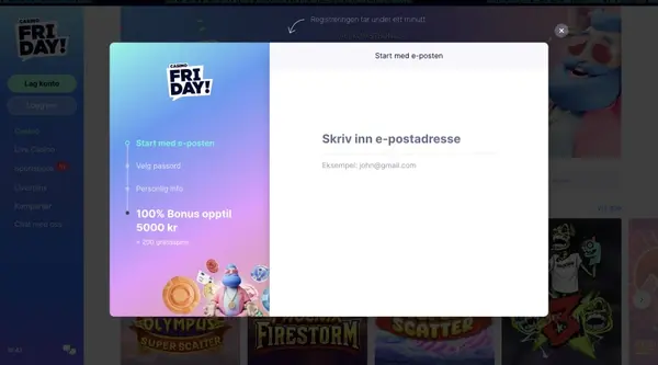 Det tar bare noen minutter å bli med. Klikk på registreringsknappen på hjemmesiden vår, og følg deretter registreringsskjemaet for å opprette kontoen din. Du blir bedt om grunnleggende opplysninger som e-postadresse, fødselsdato og kontaktinformasjon, og du må velge et sikkert passord. Etter at du bekrefter e-posten din eller fullfører det nødvendige bekreftelsestrinnet, kan du gå til kassen for å gjøre ditt første innskudd.